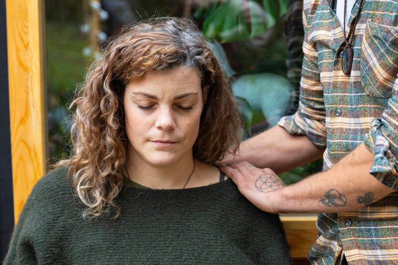 in de praktijk ziet het eruit als 2 personen die in gesprek zijn, soms in meditatie en afstemming. soms kan een ondersteunende hand op schouder of rug de juiste veiligheid en kracht geven om door de stukken heen te bewegen.